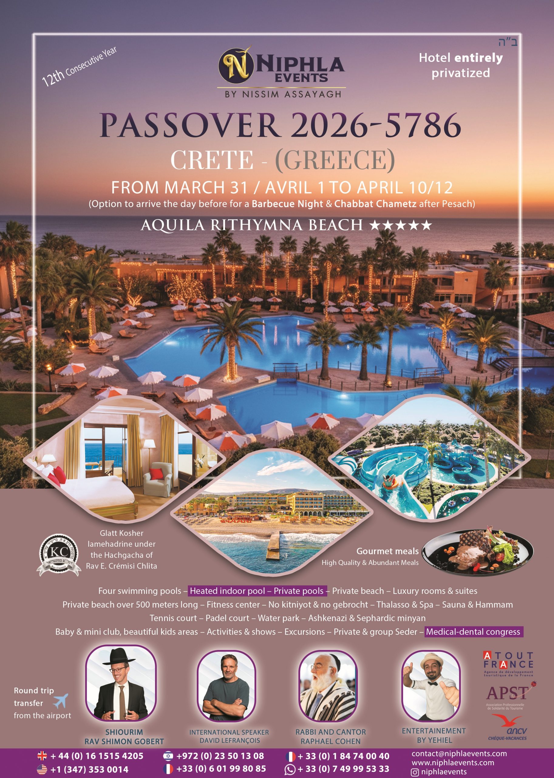 Choice of hotel, welcome gifts, variety and abundance of meals, services and chirims by our master Rabbi David Pinto, theme nights, entertainment for children and adults, ...