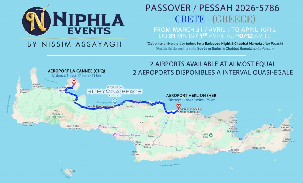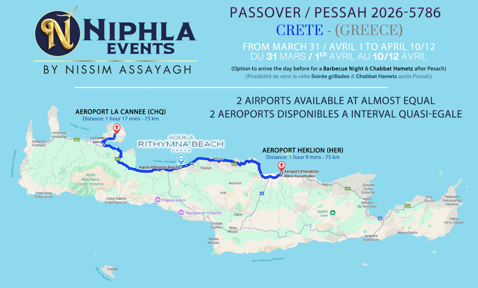 Pessah 2026 Destination Aéroport de La Cannée (CHQ) ou Aéroport Héraklion (HER), tous deux à distance quasi-égale.